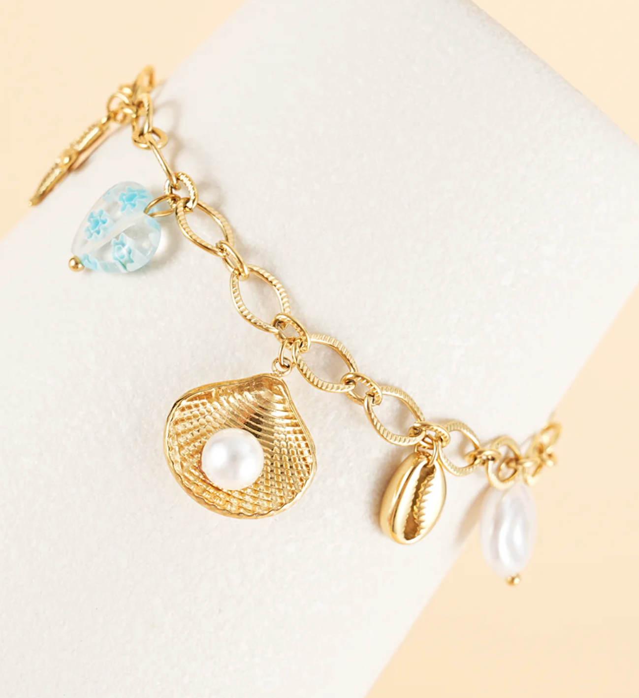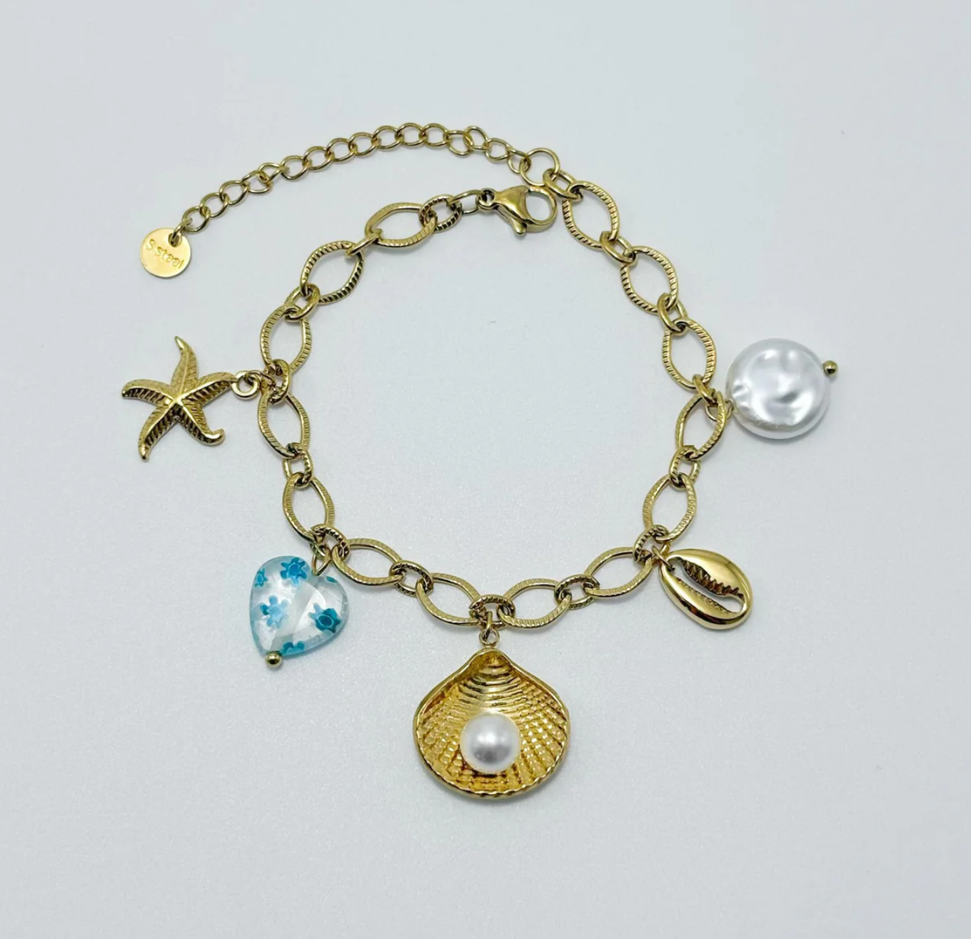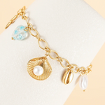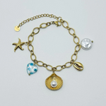 Une chaîne dorée élégante habillée de breloques aux teintes bleues, comme un fragment précieux de l’océan posé au poignet. Ce bracelet évoque la fraîcheur des vagues et la douceur des embruns, un bijou à la fois raffiné et vibrant