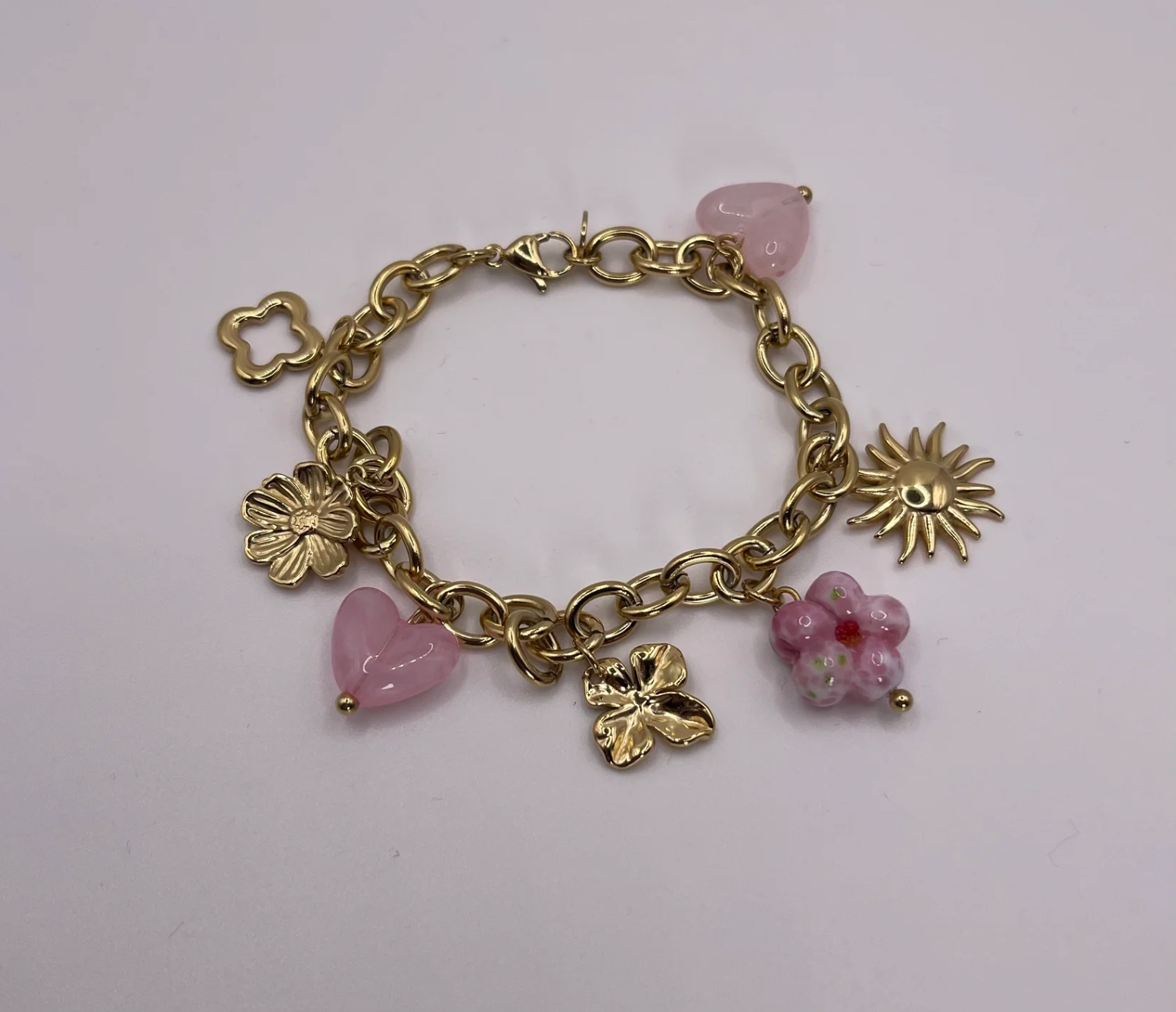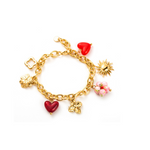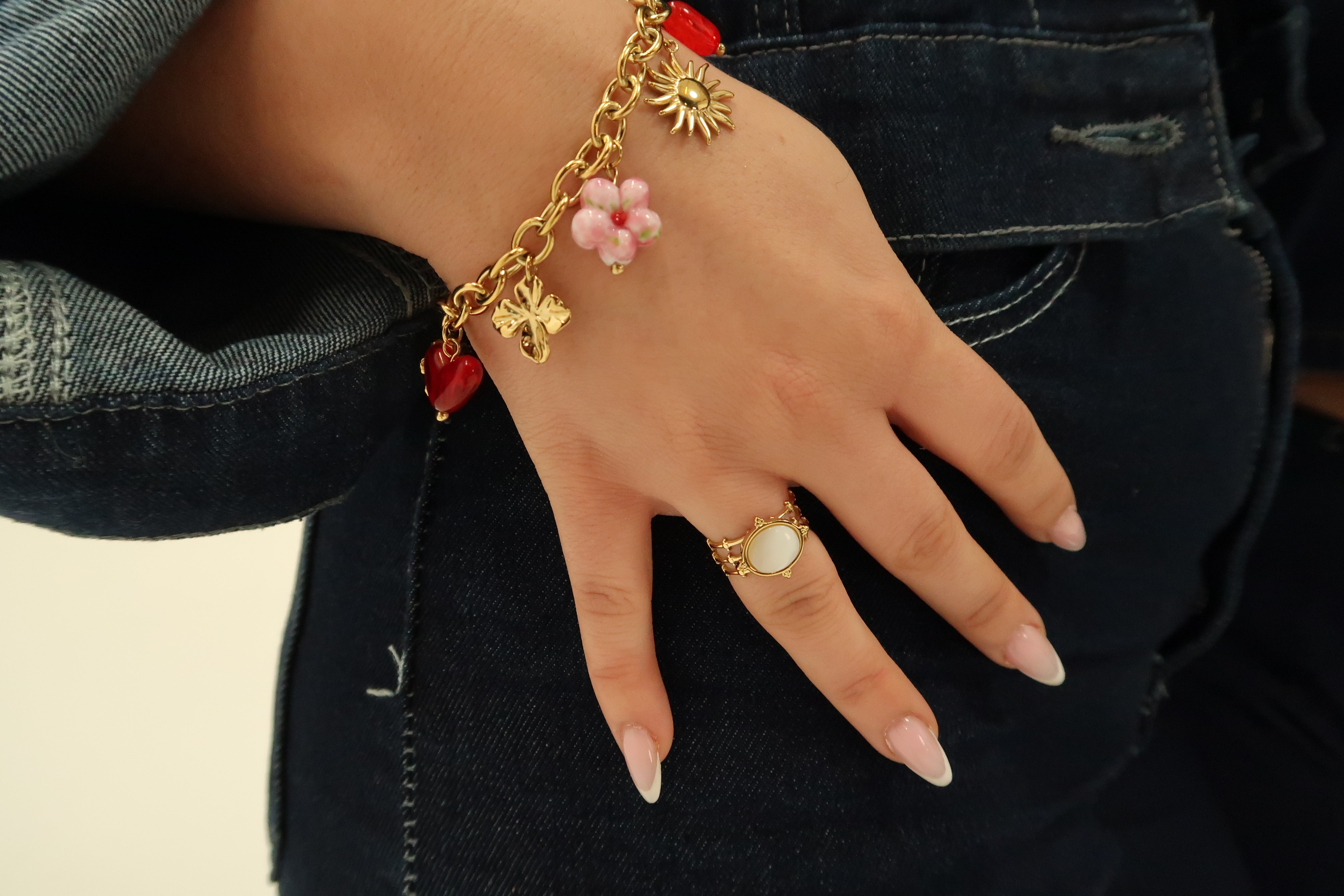 Un bijou qui danse au rythme des gestes, avec ses charms en cascade, ses couleurs qui tranchent et son doré éclatant.