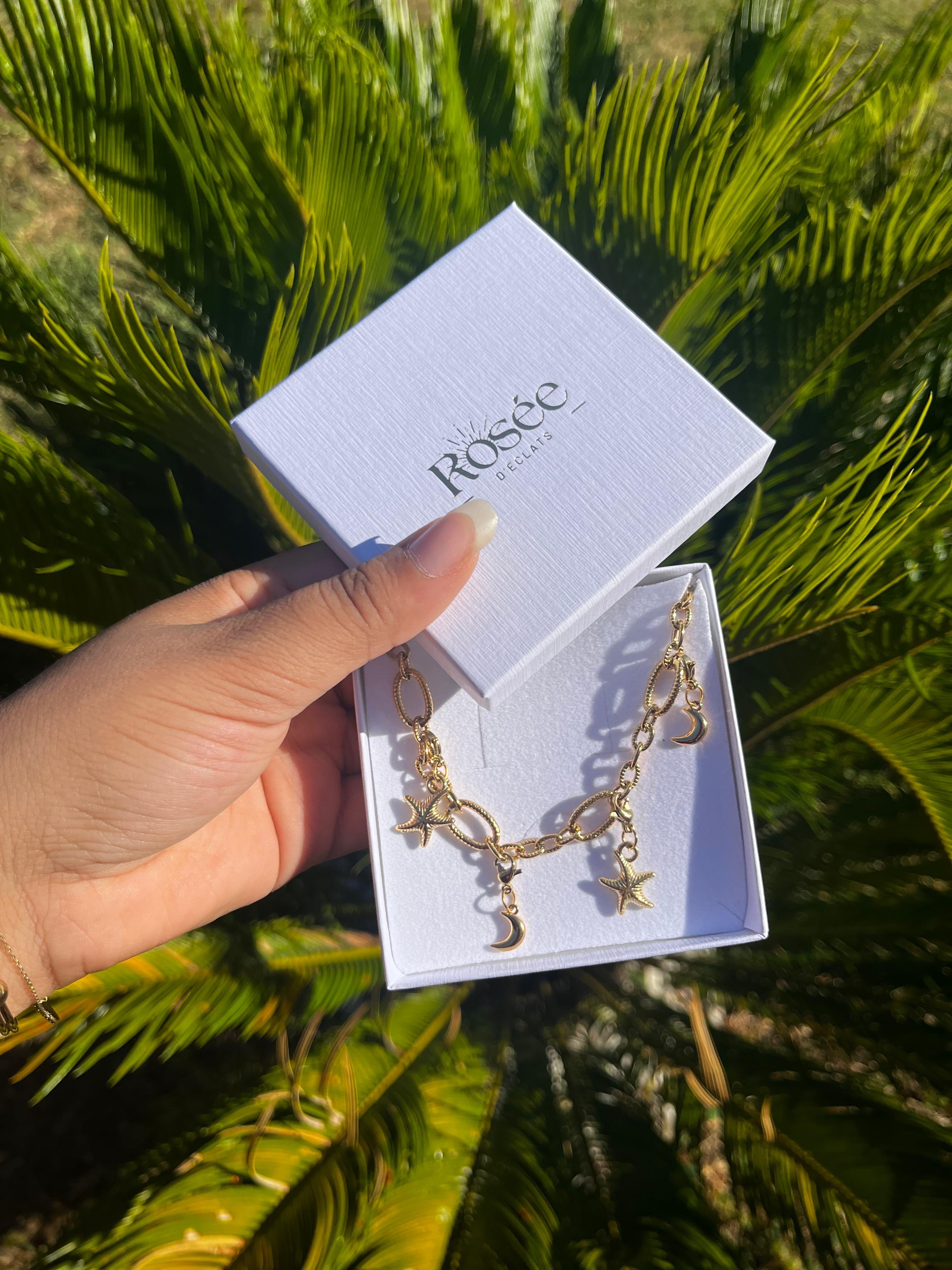 Rêve Doré, un bracelet délicatement doré qui marie l’élégance céleste à la douceur marine. Ses charms en forme de croissants de lune et d’étoiles de mer capturent l’éclat doré des couchers de soleil au bord de l’eau et la magie des nuits étoilées.
